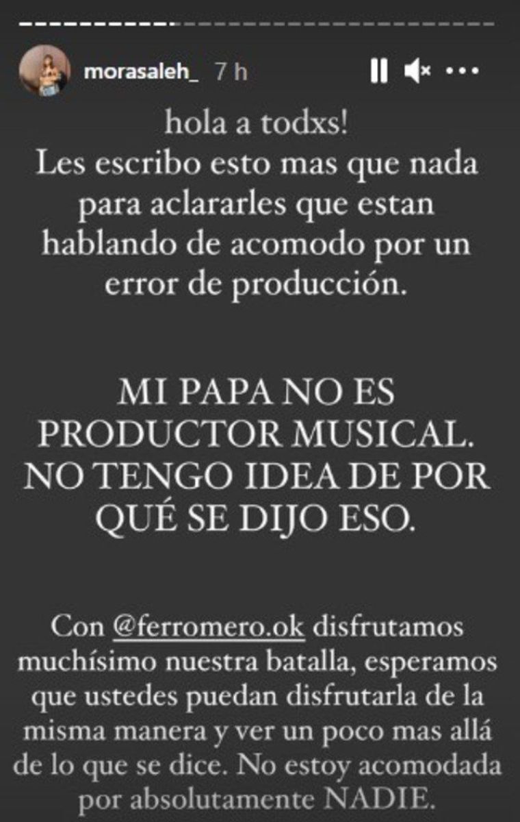 En su cuenta de Instagram, Mora publicó un descargo para aclarar los rumores. "Hola a todos. Les escribo esto más que nada para aclararles que están hablando de acomodo por un error de la producción. Mi papá no es productor musical. No tengo idea de por qué se dijo eso", aseguró, haciendo referencia a la presentación de Marley.