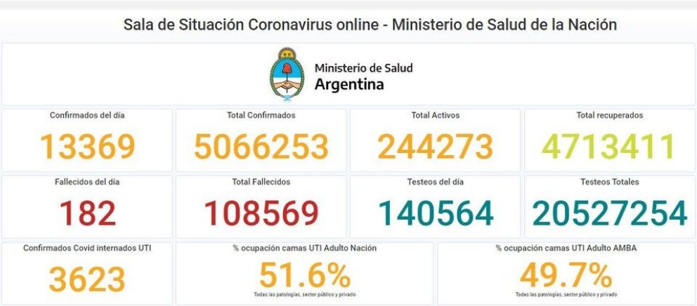 El reporte del Ministerio de Salud confirmó 13.369 nuevos contagios de coronavirus en las últimas 24 horas. Con estos registros, suman 5.066.253 casos desde que comenzó la pandemia. Además, se registraron 182 nuevas muertes de pacientes con coronavirus lo que eleva la cifra de víctimas mortales en el país a 5.066.253.