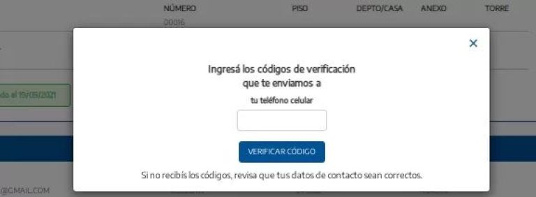 Luego se deberá confirmar la cuenta de correo electrónico (e-mail) y el número de teléfono celular. En el caso de que se haya agregado un número de teléfono FIJO, NO se solicita la verificación.