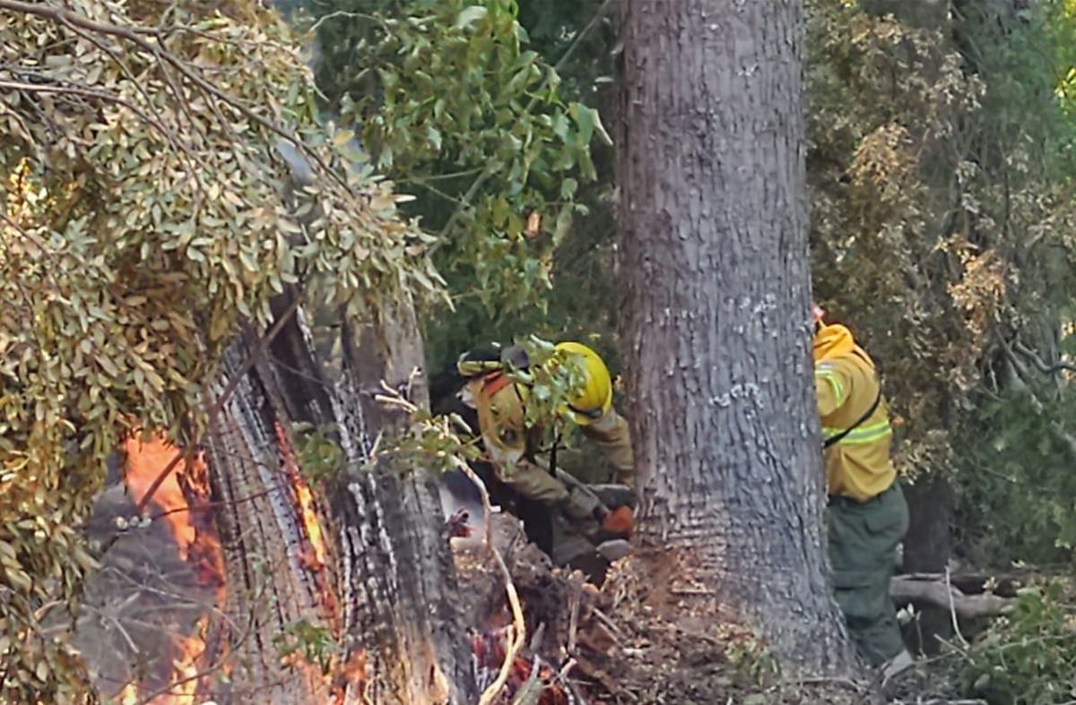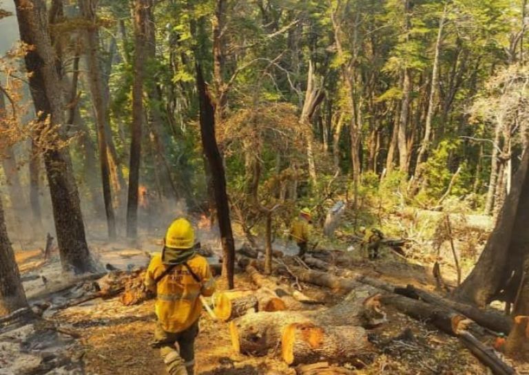 Consecuentemente hasta el lugar llegaron tres móviles del SPLIF Bariloche con varios combatientes que, tras el retiro del helicóptero, permanece realizando líneas con herramientas de zapa y equipo de corte para contener en el incendio.