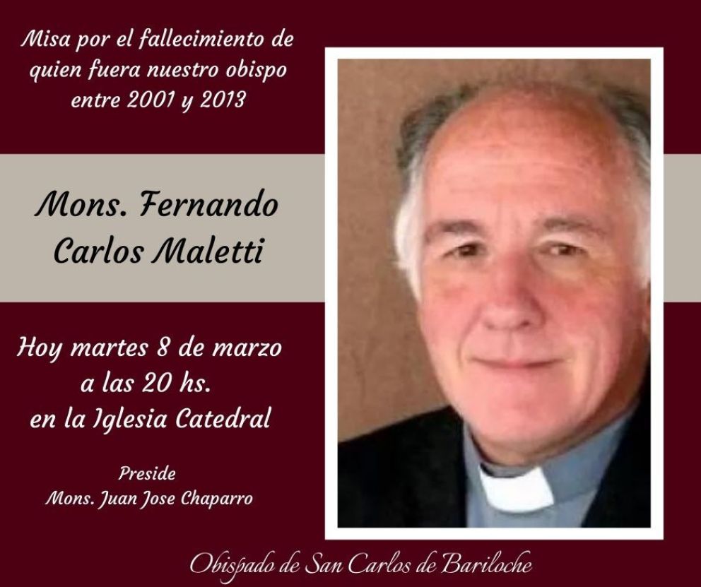 En horas de ayer, martes 8, se conoció la triste noticia del fallecimiento del obispo Fernando Maletti, quien estuvo al frente de la Diócesis Bariloche desde el 22 de setiembre de 2001, cargo que ocupó hasta el 6 de mayo de 2013. A partir de esa fecha fue a cubrir el mismo espacio en la Diócesis de Merlo-Moreno.