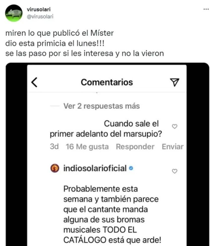 “¿Cuándo sale el primer adelanto?” preguntó un usuario. “Probablemente, esta semana, y también parece que el cantante manda alguna de sus bromas musicales. Todo el catálogo está que arde", le respondió. En la publicación, Virginia escribió: “El Míster dio esta primicia el lunes. Se las paso por si les interesa y no la vieron”.