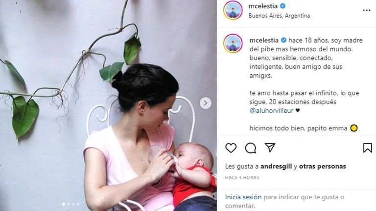 “Hace 18 años soy madre del pibe más hermoso. Bueno, sensible, conectado, inteligente y buen amigo de sus amigos”, expresó Celeste en su cuenta de Instagram con una foto suya amantándolo, cuando recién nacido.