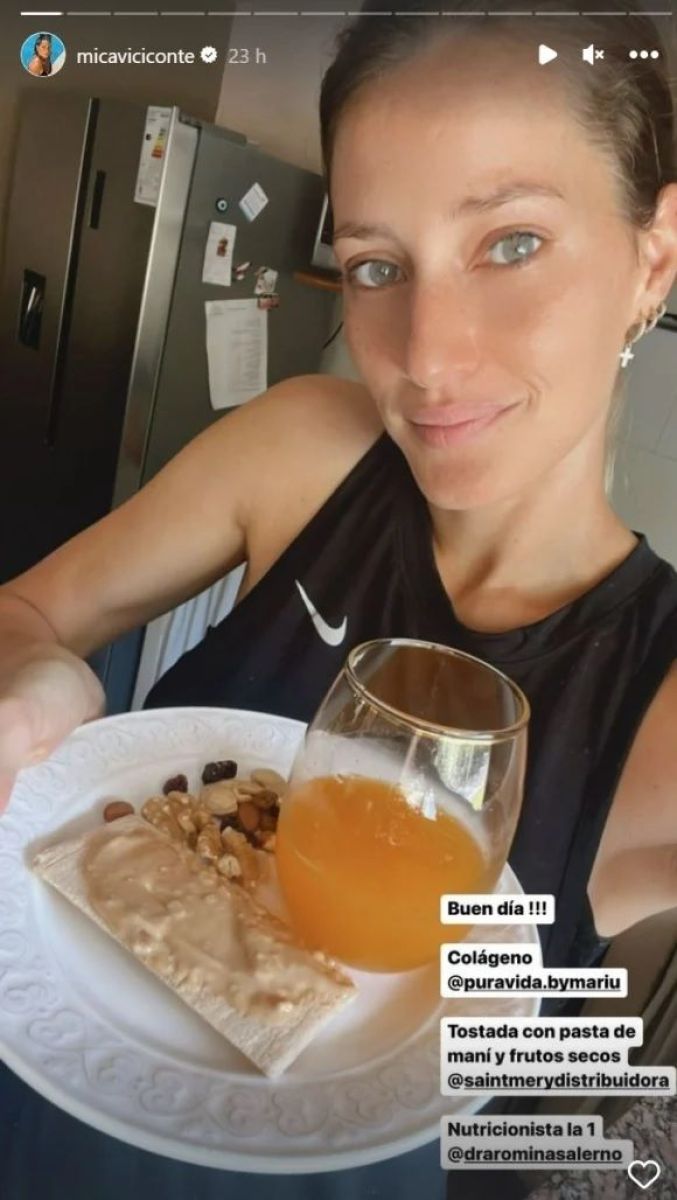 “¡Buen día! Colágeno con jugo de naranja, tostada de arroz con pasta de maní y frutos secos”, publicó Viciconte en su Instagram, mostrando la preparación lista y remarcando que esta receta se la pasó su nutricionista Romina Salerno como parte de su alimentación previa al gimnasio.