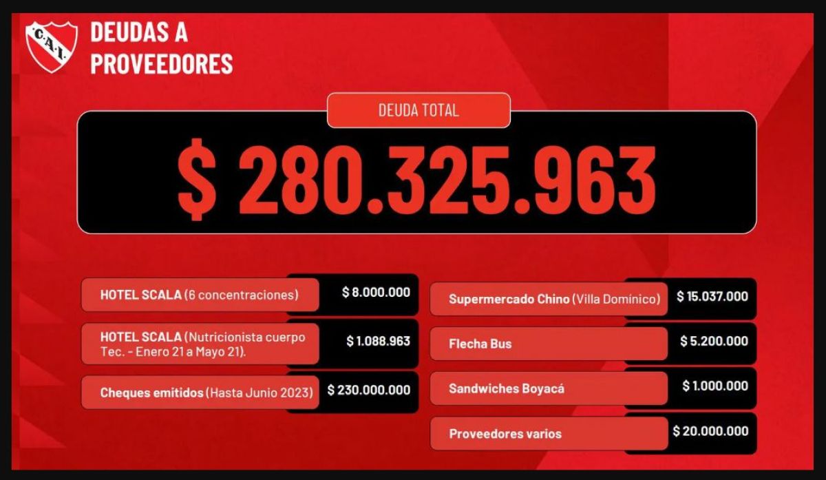 Pero los detalles casi absurdos surgen de la placa con las “deudas a proveedores”. Al hotel Scala, donde se concentra habitualmente el plantel antes de los partidos, Independiente le debe 8 millones de pesos. Al cuerpo de nutricionistas, un millón, también en moneda nacional (por cinco meses de servicios impagos). A la empresa de micros que traslada a los futbolistas, 5.200.000.