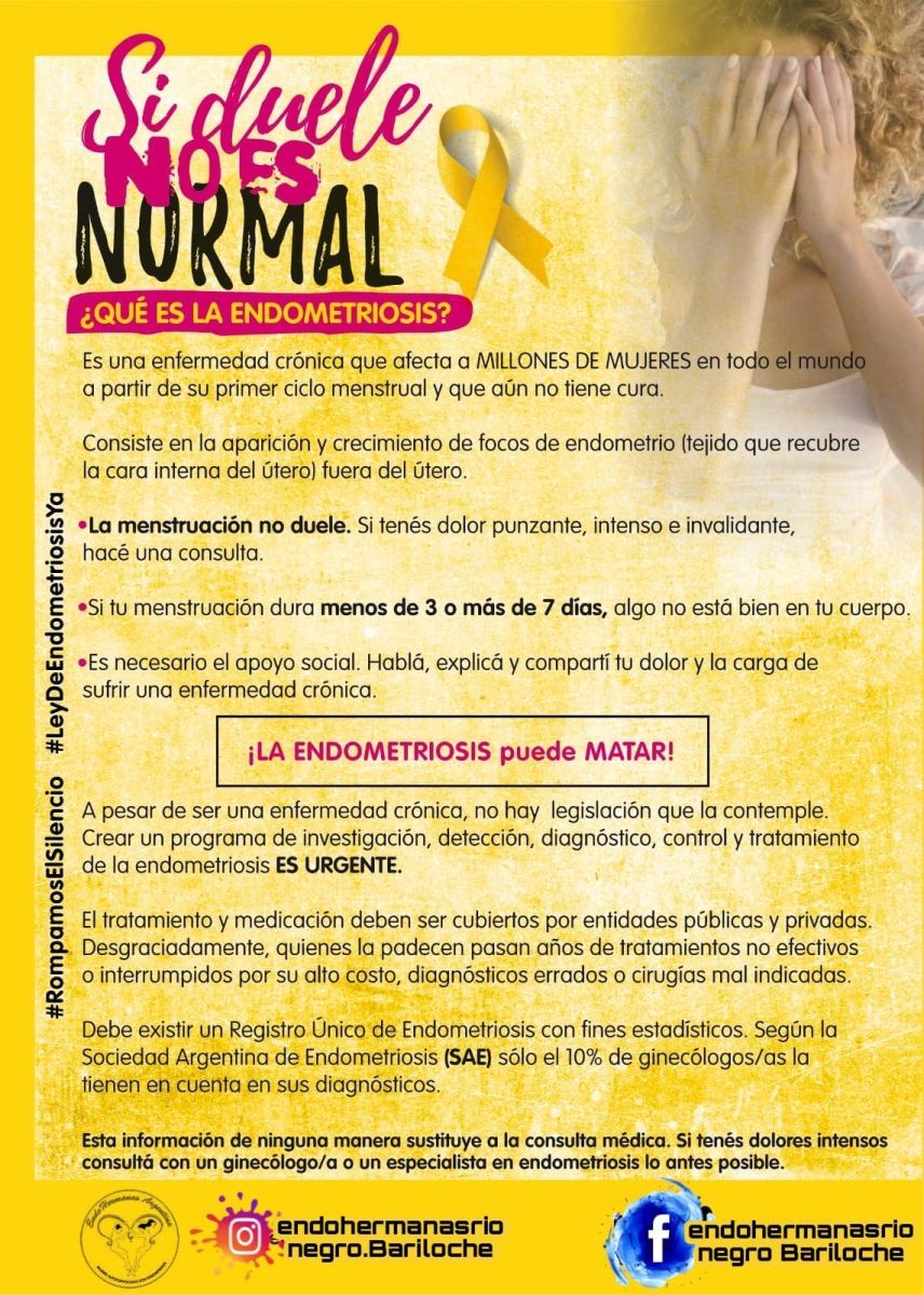 Un grupo de mujeres autoconvocadas pacientes de endometriosis denominado "Endohermanasrionegro Bariloche" convoca a la comunidad para el día 29 de noviembre a una serie de actividades con el fin de difundir y visibilizar una enfermedad que en el país ya ha llegado al millón de mujeres.