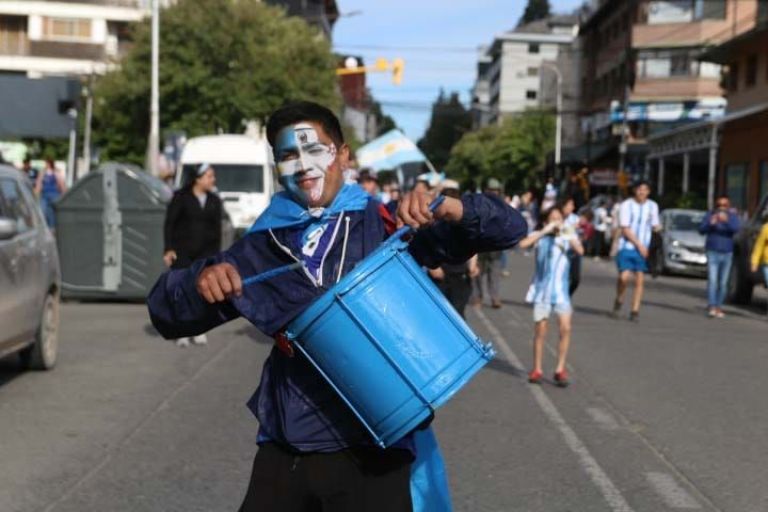Ni bien el árbitro anunció el final del encuentro, vecinos, vecinas y turistas que se encuentran en Bariloche coparon las calles de la ciudad, vestidos con los colores argentinos, bombos, pancartas y banderas.