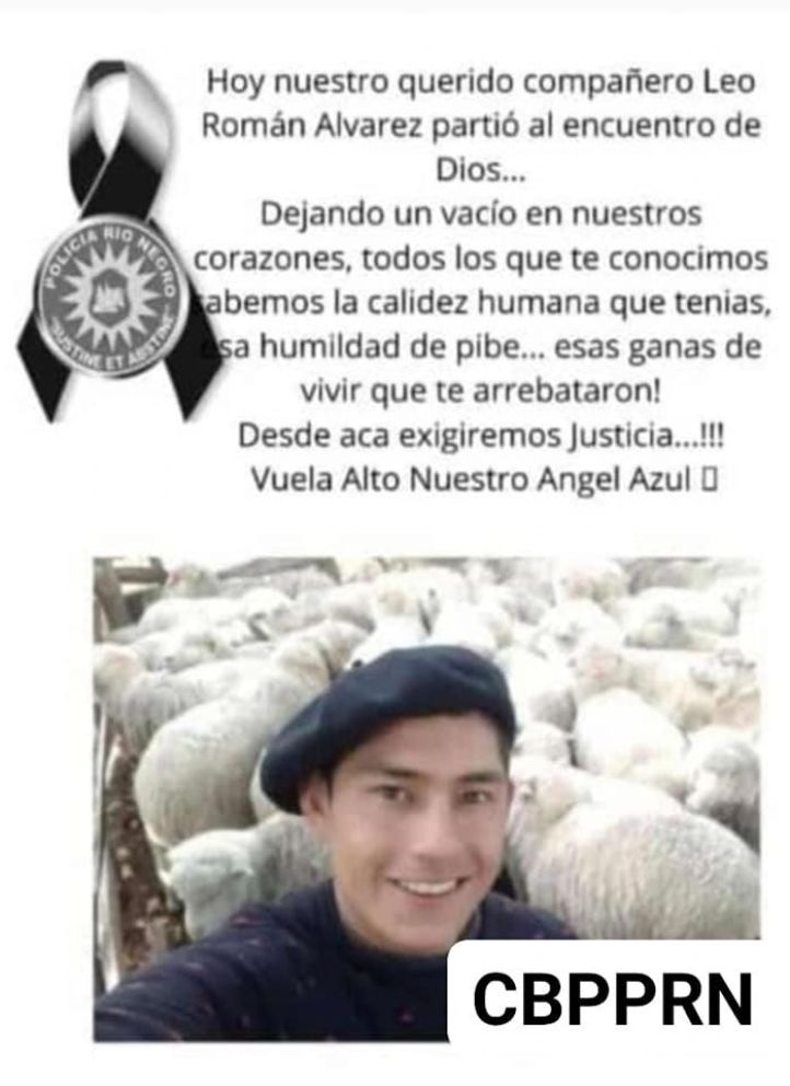 El "Consejo de Bienestar Policial Rio Negro" publicó en su página de Facebook una foto junto a una descripción que incluye un contundente reclamo sobre la discriminación policial que se sufre "como se trata de la vida de un policia, de un joven policía de 25 años, un chico de campo y con padres puesteros, a nadie parece importarle. Solamente a nosotros, los azules, que sentimos que nos arrancaron injustamente un hermano de sangre azul, ante la mirada de todos y el silencio social, político y de nuestros superiores...".