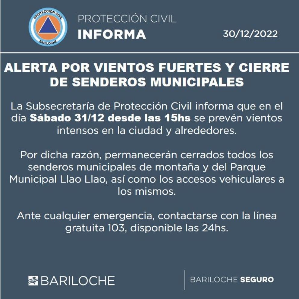 El último día del año, el sábado 31 diciembre, tendrá una temperatura máxima de 25 grados y una mínima de 7 grados, hasta las 15 horas, cuando se espera el ingreso de vientos fríos, que provoca el aviso de cierre de senderos desde Protección Civil.