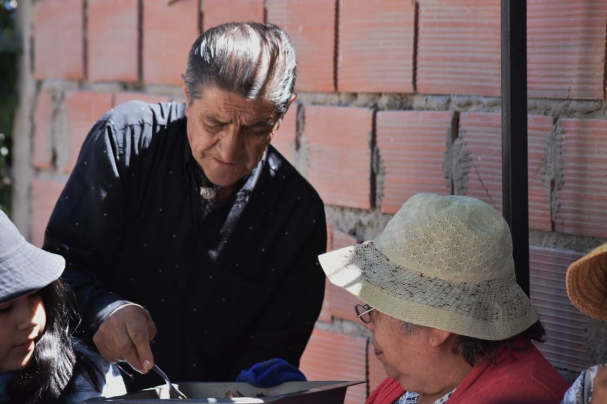Don Domingo Faustino Rojas estuvo al frente de la parrilla preparando el asado para los participantes. Vive en Bariloche, pero nació en Río Chico. Desde allá trajo un cordero para regalarles: “Tenía que cocinarlo también y lo hice con mucho amor”, dijo el flamante cocinero.