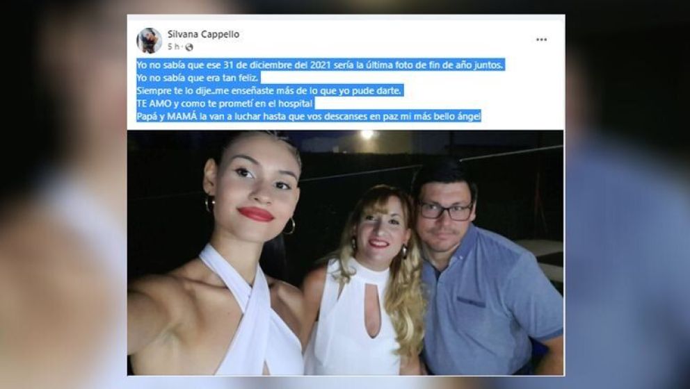 Yo no sabía que ese 31 de diciembre del 2021 sería la última foto de fin de año juntos. Yo no sabía que era tan feliz. Siempre te lo dije... me enseñaste más de lo que yo pude darte. TE AMO y como te prometí en el hospital, papá y MAMÁ la van a luchar hasta que vos descanses en paz, mi más bello ángel”, escribió la mujer en su cuenta de Facebook.