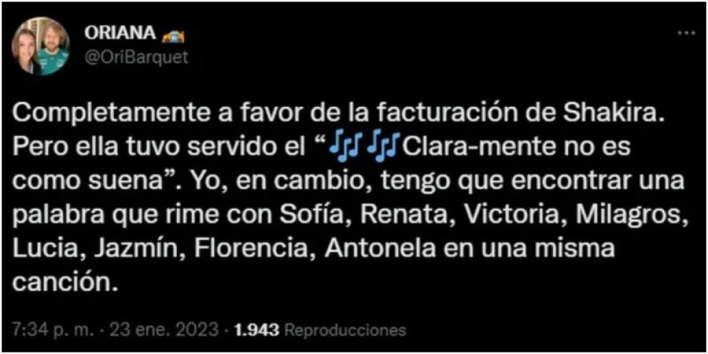 “completamente a favor de la factura de Shakira, pero ella tuvo servido el ‘Clara-mente no es como suena’”, escribió en un tuit la mediática antes de agregar: “Pero yo, en cambio, tengo que encontrar una palabra que rime con Sofía, Renata, Victoria, Milagros, Lucía, Florencia, Antonela, en una misma canción”.