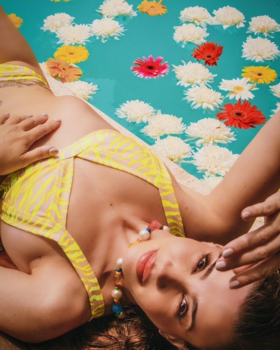 La artista subió un pequeño álbum que tenía guardado dentro de su galería de fotos. En las mismas se pueden ver tres imágenes suyas llevando diferentes trajes de baño, dos microbikinis multicolores y el otro en lo que aparenta ser una malla enteriza.