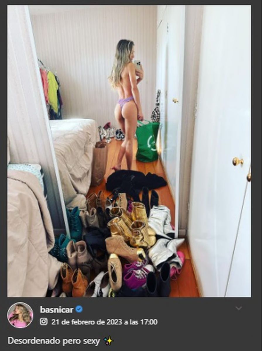 La famosa publicó al pie de su foto una leyenda que decía: “Desordenado, pero sexy”. Y es que, además de sacar a la luz toda su sensualidad, intencionalmente dejó ver en primer plano el suelo de su habitación, llena de una pila de zapatos que mostraban que el cuarto estaba en completo caos.
