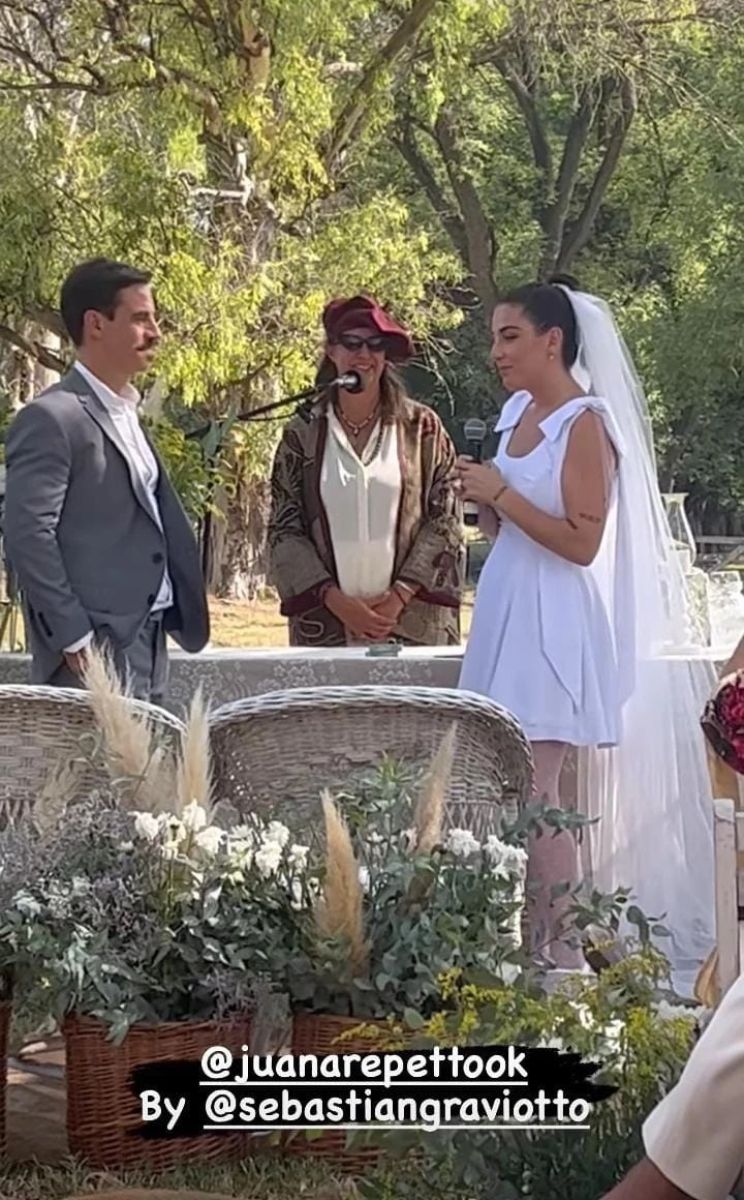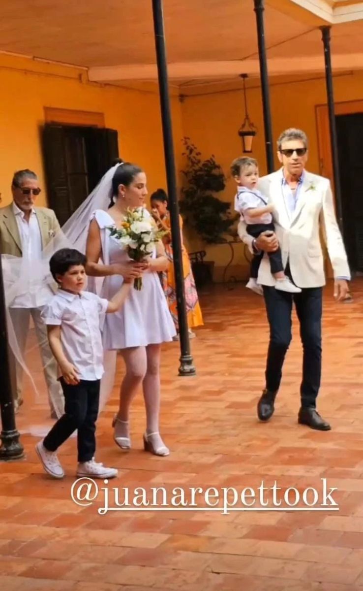 La boda se celebró al aire libre y según trascendió, la novia ingresó a la ceremonia con sus dos hijos, Toribio y Belisario, además de acompañada por Sebastián Graviotto, rompiendo con la tradición de que el padre acompañe a su hija.