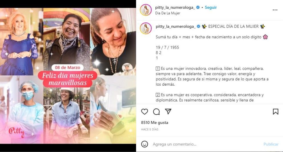 Esta vez Pitty la Numeróloga eligió variar en el contenido que suele subir y optó por dejar de lado un momento su trabajo para enseñarle a sus seguidoras cómo hacer para obtener su número de la suerte. “Sumá tu día + mes + fecha de nacimiento a un solo dígito”, explicó en su cuenta de Instagram.