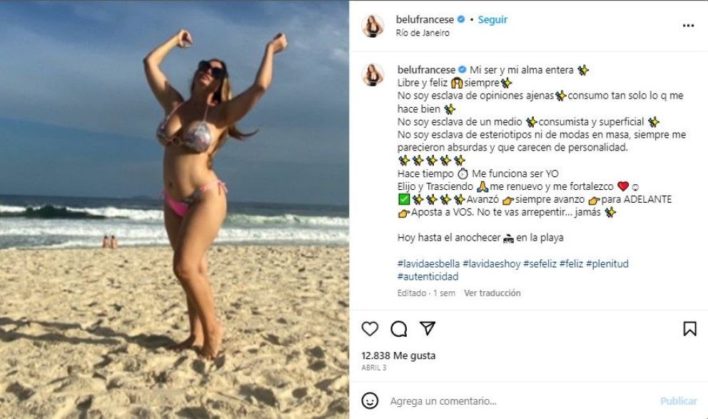 Belén Francese decidió tomarse unos días de vacaciones junto a su familia. Para ello, partió rumbo a Brasil en donde posó en bikini. Pese a lucir espléndida, no faltaron aquellos desubicados que se animaron a criticarla. Lejos de quedarse callada, respondió.