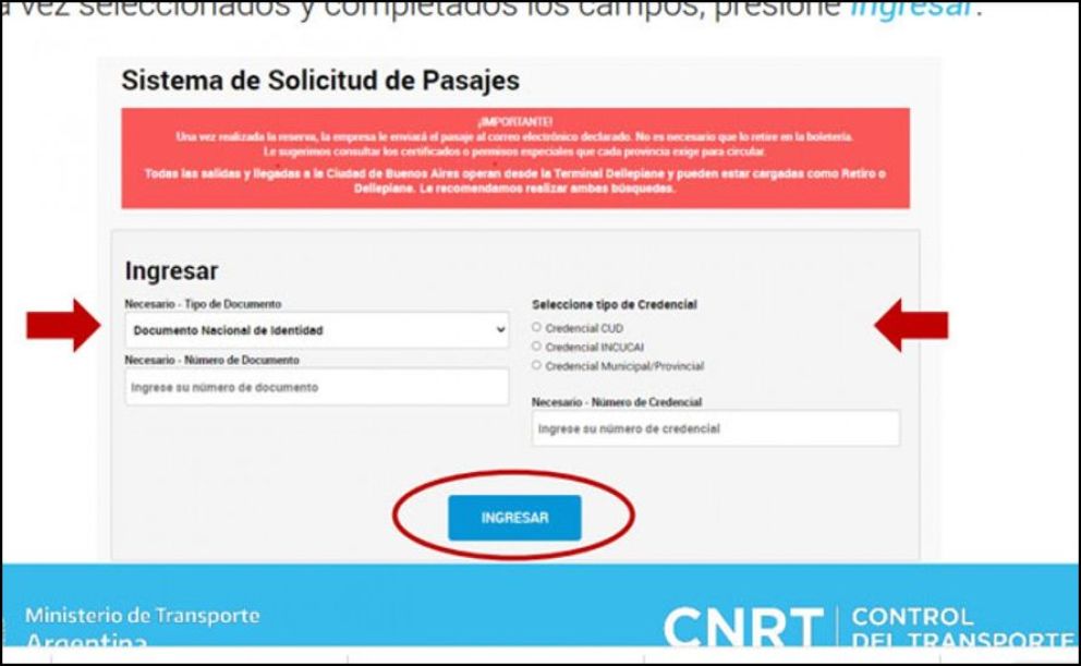 Asimismo, la Comisión Nacional Reguladora de Transporte (CNRT) a fin de proporcionar otra herramienta para la gestión de pasajes sin la necesidad de que la persona con discapacidad tenga que acercarse a una empresa de transporte, creó la página de reserva de pasajes vía internet. Desde el siguiente enlace https://reservapasajes.cnrt.gob.ar/web/ingresar se puede realizar la reserva de pasajes para tramos nacionales y terminales habilitadas.