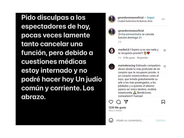 Este domingo, Romano publicó un mensaje en su cuenta oficial de Instagram este domingo que generó preocupación. "Estoy internado", comunicó, advirtiendo también la suspensión de la función de Un judío común y corriente, la obra que lo tiene de protagonista en el teatro Chacarerean.