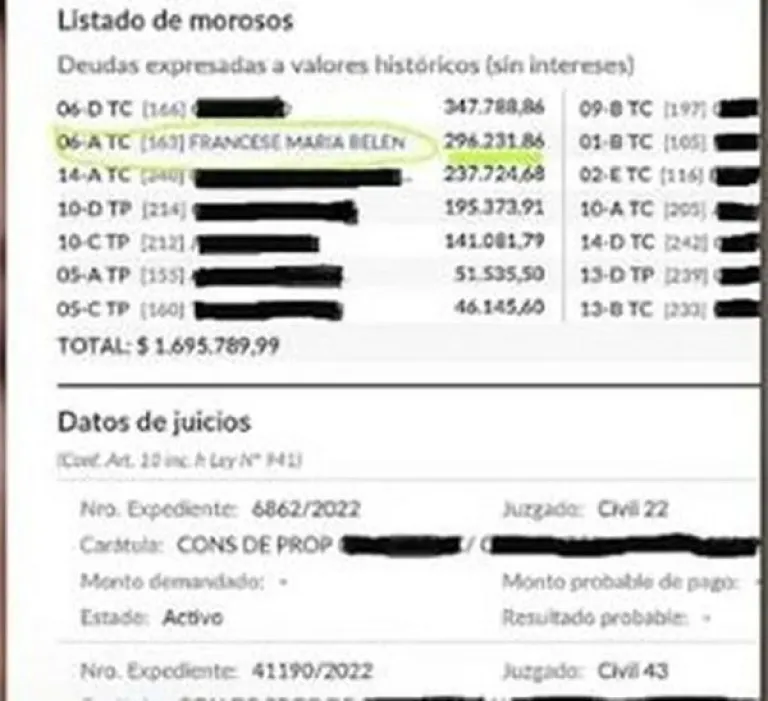 El periodista de Intrusos agregó cuál era la denuncia y la cifra que la artista estaría adeudando. "Están dando a conocer que debe 300 mil pesos en expensas. Están a punto de pasar a juicio, de iniciarle acciones legales, serían como unos 6 meses sin intereses", detalló sobre una deuda que sería precisamente de $296.231,86.