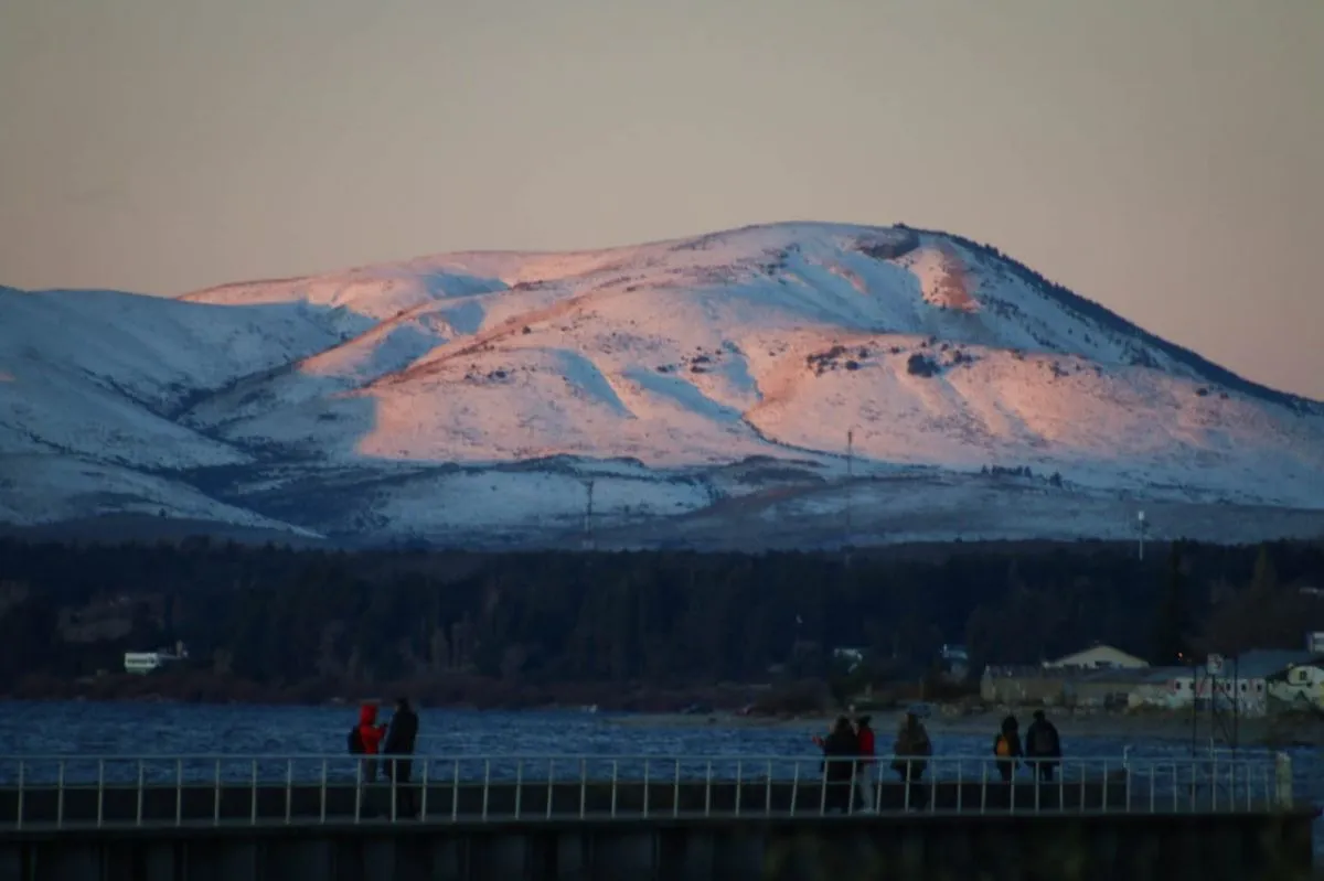 Vecinos y turistas se maravillaron mientras las luces del atardecer se difuminaban gradualmente, dando paso a una penumbra dorada y a las primeras estrellas que comenzaron a asomarse en el firmamento. El contraste entre el blanco de las montañas cubiertas de nieve y los tonos cálidos del cielo y el agua creó una postal que encanta y sorprende hasta a los residentes.