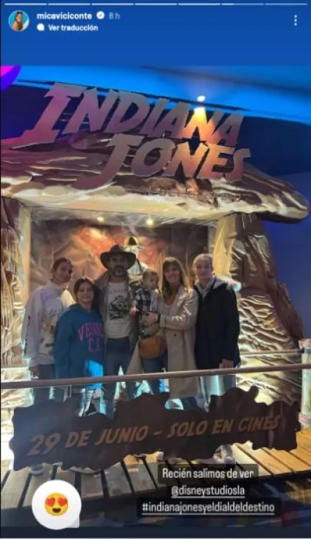 En este sentido, quien publicó la foto en sus redes sociales fue Mica Viciconte, quien se mostró con Luca Cubero en sus brazos y rodeada por Indiana, Allegra, Sienna y su pareja. En la imagen dejó entrever que la película elegida por la familia fue Indiana Jones y el dial del destino.