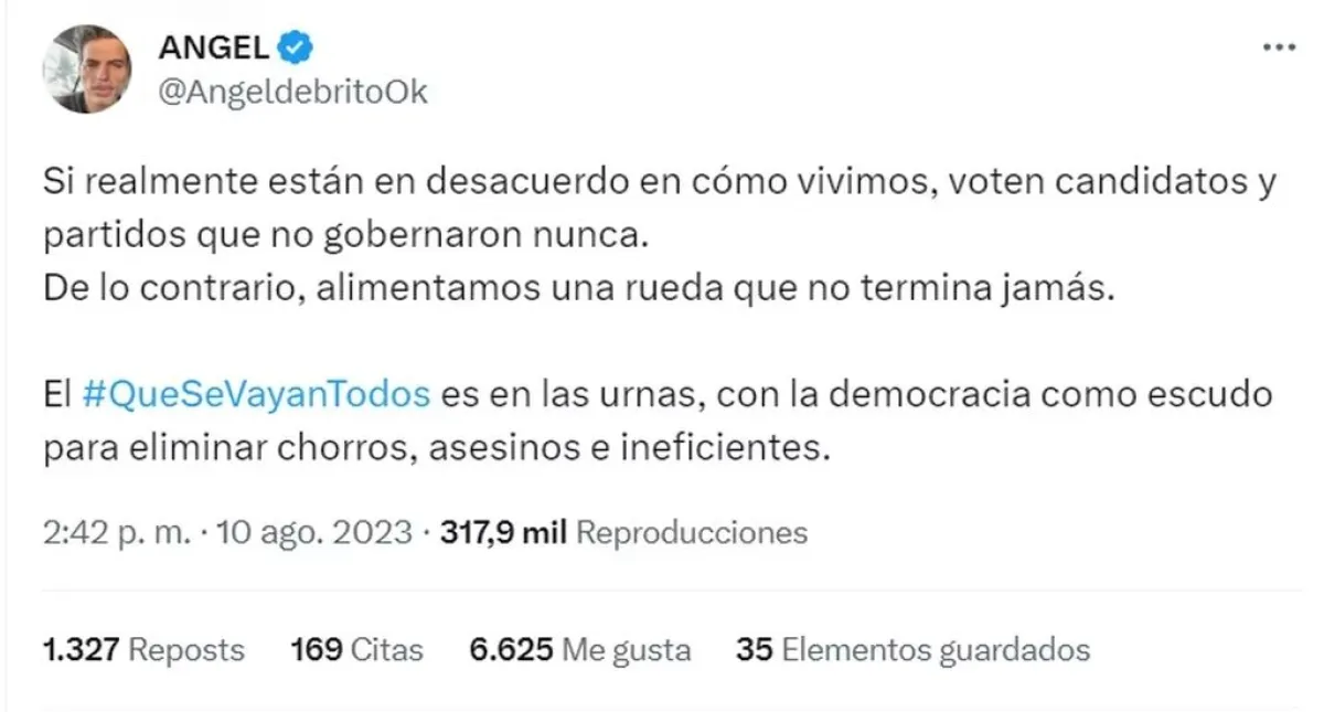 “El #QueSeVayanTodos es en las urnas, con la democracia como escudo para eliminar chorros, asesinos e ineficientes”, cerró Ángel. Luego de publicar este tweet, lo dejó fijado para que sea lo primero que lea un usuario cada vez que entre a su perfil en esa red social.