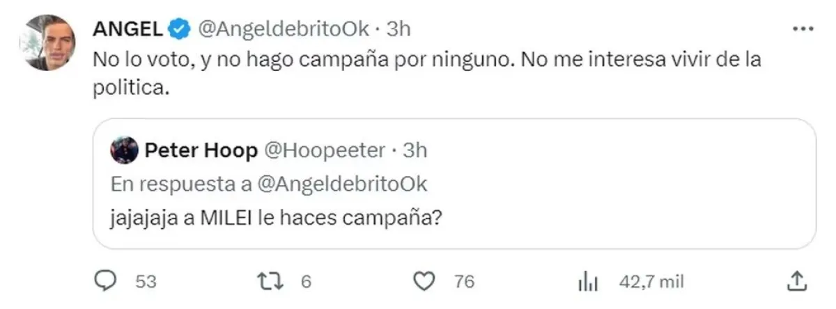 Ante la insistencia de los usuarios, el periodista se encargó de aclarar que su mensaje no fue tendencioso y que no hace campaña por ninguno de los candidatos, subrayando que no le interesa eso: “No lo voto y no hago campaña por ninguno. No me interesa vivir de la política”.