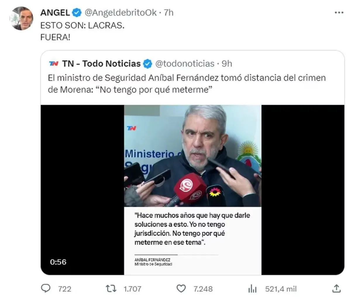 Por otro lado, Ángel también republicó en sus redes una publicación de TN en la cual Anibal Fernández, Ministro de Seguridad, aseguraba que no tenía razones para involucrarse en este caso. “Esto son: lacras. Fuera!”, dijo el presentador de LAM, indignado con el descargo del político.
