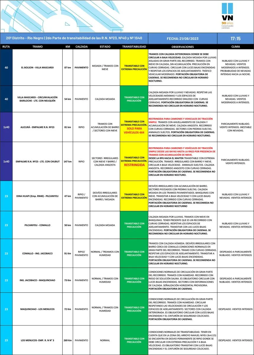 En ese sentido el escrito destaca que en Ruta 40, entre Bariloche y El Bolsón, el camino se encuentra transitable con extrema precaución, con nevadas en las zonas altas pero sin acumulación por el momento.