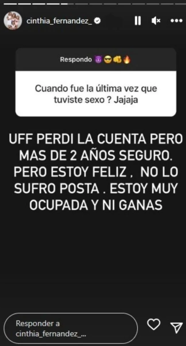 A menudo, los influencers utilizan las historias de Instagram para interactuar con sus seguidores y fue aquí donde Cinthia realizó una confesión respondiendo a una pregunta indiscreta: "¿Cuándo fue la última vez que tuviste sexo?".