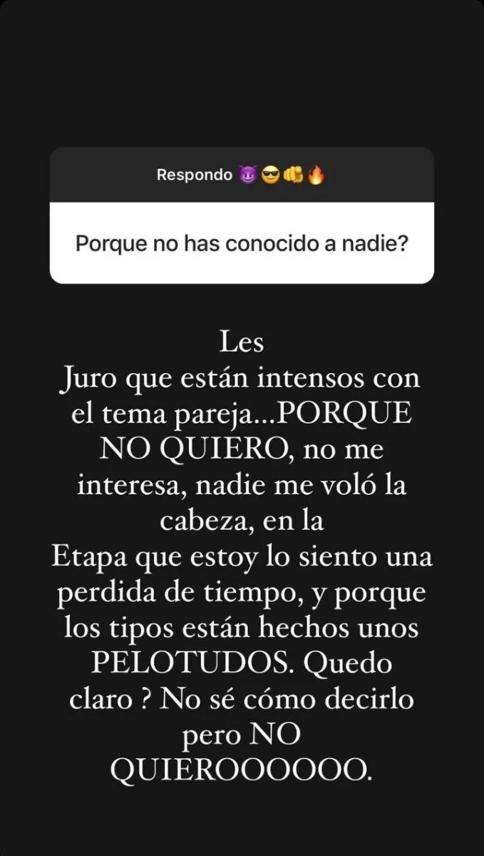 Referido a eso, se sumó una nueva inquietud de parte de otro seguidor anónimo: "¿Por qué no has conocido a nadie?". Indignada, Cinthia respondió sin pelos en la lengua: "Les juro que están intensos con el tema pareja. Porque no quiero, no me interesa, nadie me voló la cabeza. En la etapa que estoy, lo siento una pérdida de tiempo y porque los tipos están hechos unos pelotudos".