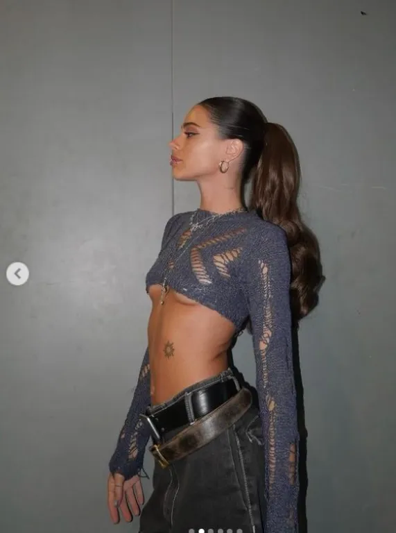 El top con el que reapareció Tini Stoessel es color azul grisáceo, pero brilloso. Además, con este se mantiene en el estilo Underboob, del cuál se mostró como habitual, ya que son varias las veces que utiliza prendas de este estilo.
