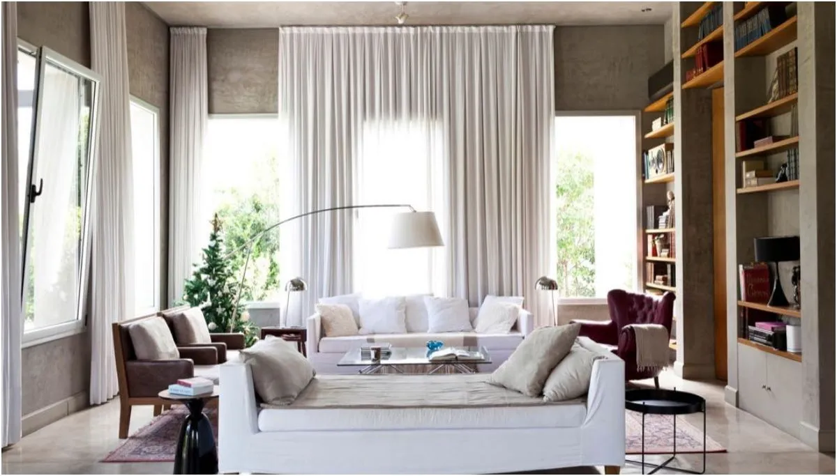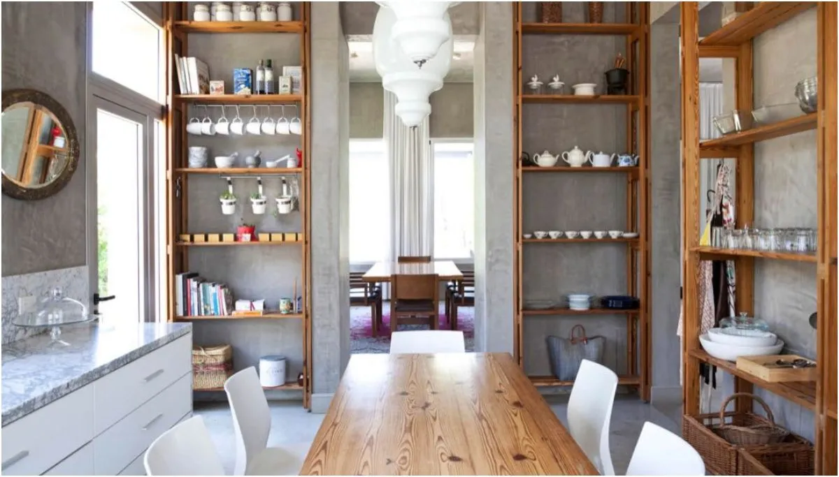 El corazón del hogar es el living-comedor, que respira elegancia gracias al cemento alisado. Los sofás con fundas blancas, diseñados para la practicidad, coexisten armoniosamente con un sofá vintage de cuero bordó y respaldo capitoné, logrando un equilibrio entre lo moderno y lo clásico que define toda la casa.