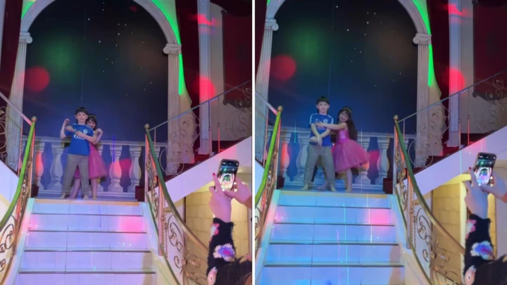 El cumpleañero brilló y se lució como un príncipe, y posó para las fotos ante todos sus invitados desde la altura en una lujosa escalinata. Antón, usando un jogging y sin calzar nada en sus pies, se dejó abrazar por una de sus amiguitas que estaba ahí acompañándolo, vestida de princesa.