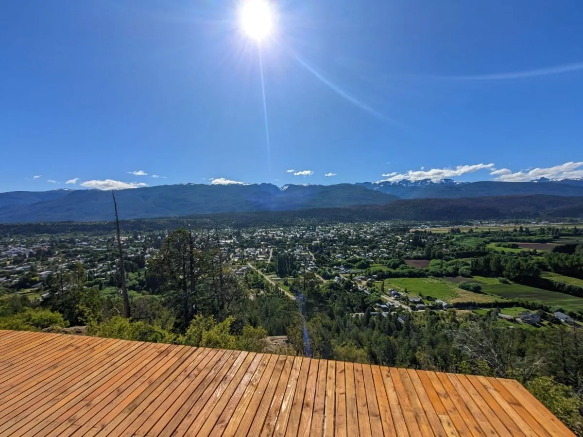 Desde el cual se aprecia el acceso sur a El Bolsón, la zona de Lago Puelo y los cordones montañosos del noroeste del Chubut.