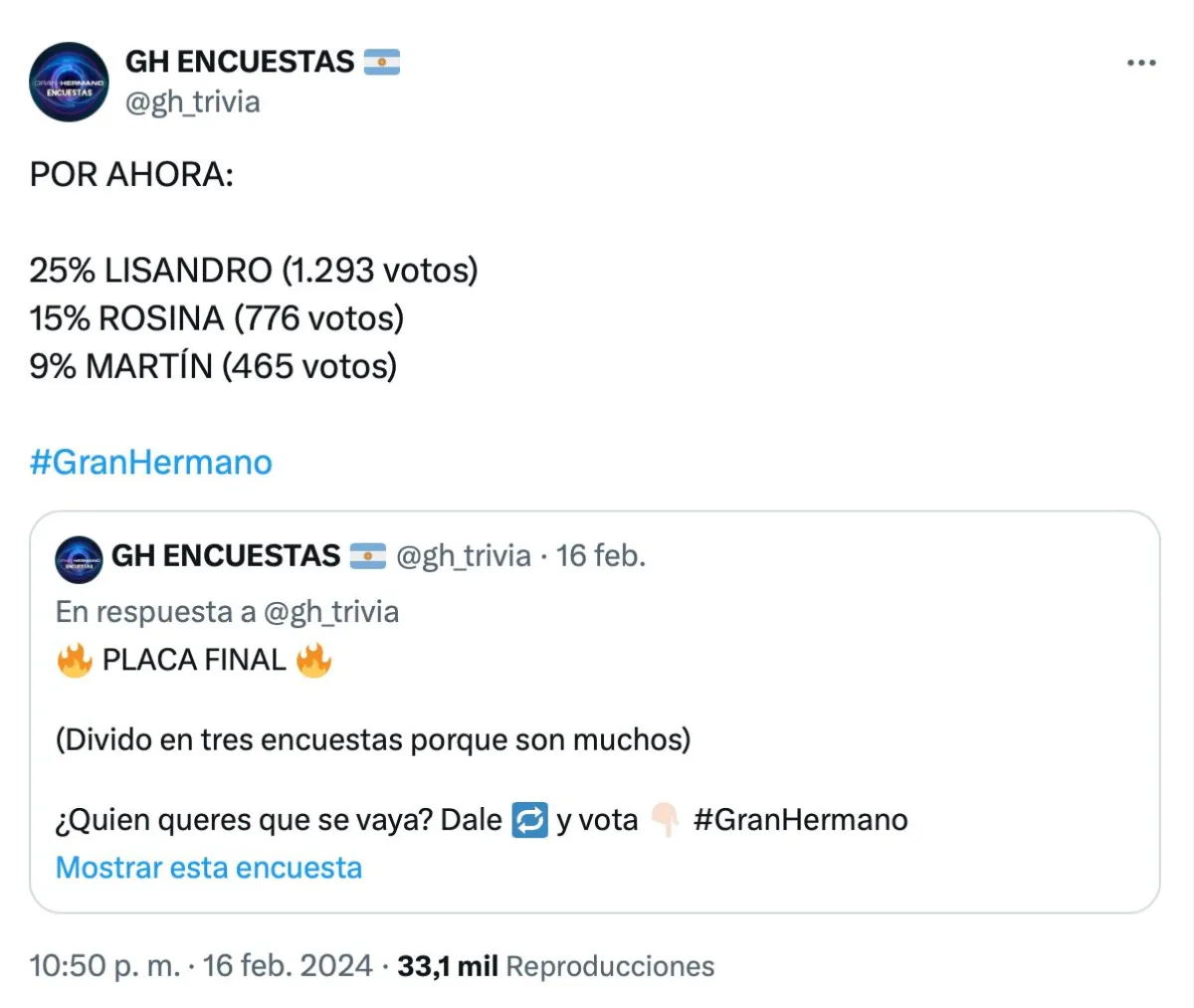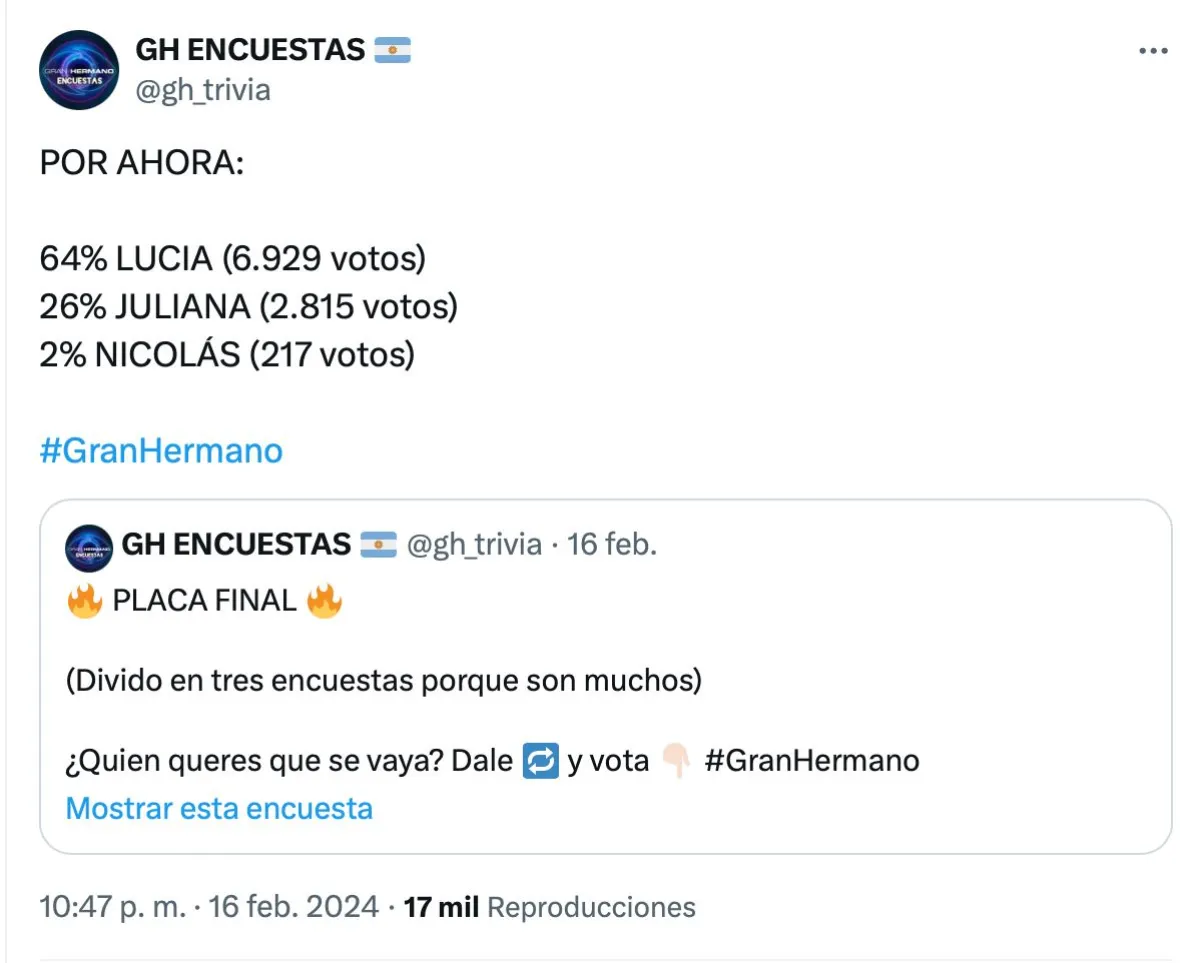 Como era una placa con muchísimos nombres, el responsable de la cuenta de X hizo tres encuestas con tan sólo tres los nombres de los participantes y observó cuáles obtuvieron la mayor cantidad de votos para decir quiénes tienen probabilidad de irse del reality.