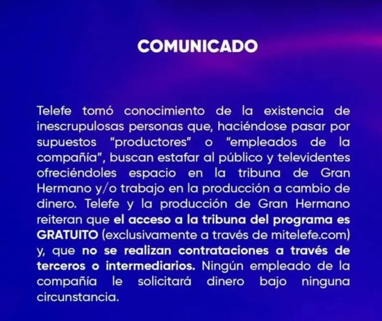 Con este comunicado, Telefe busca proteger a su público y garantizar la transparencia y la confianza en el programa. Además, envía un mensaje claro a los estafadores de que no tolerará ningún tipo de engaño en relación a Gran Hermano.