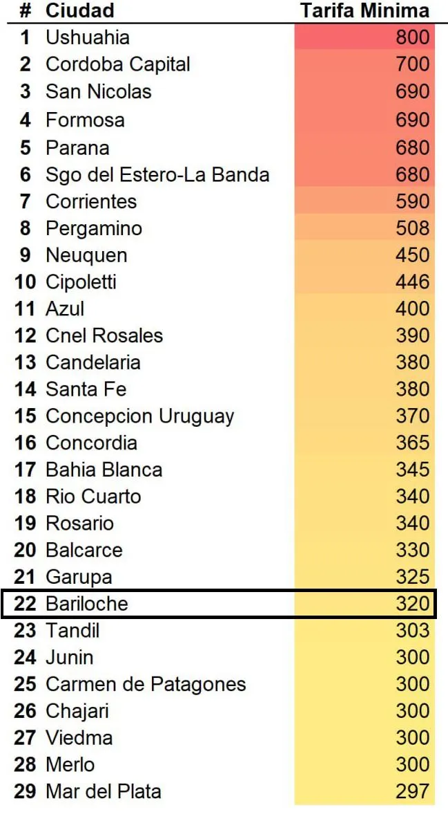 Cuando haya un nuevo aumento de tarifa se verá en qué posición queda Bariloche, en un listado en el que nadie quiere estar en los primeros puestos.