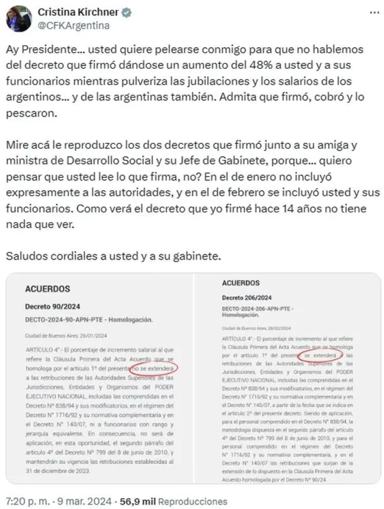 "Ay Presidente... usted quiere pelearse conmigo para que no hablemos del decreto que firmó dándose un aumento del 48% a usted y a sus funcionarios mientras pulveriza las jubilaciones y los salarios de los argentinos... y de las argentinas también. Admita que firmó, cobró y lo pescaron", disparó Cristina en el inicio de su descargo.