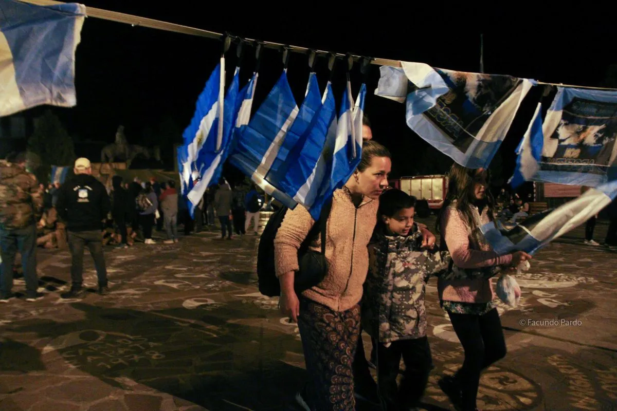 Hilario Flores, algo así como el vendedor “oficial” de banderas en cuanto acto o movilización hay en la ciudad, permanece hasta tarde en el Centro Cívico… Cerca de las dos se lo ve cansado, sentado en un banco, pero aún con su oferta de estampas celestes y blancas.