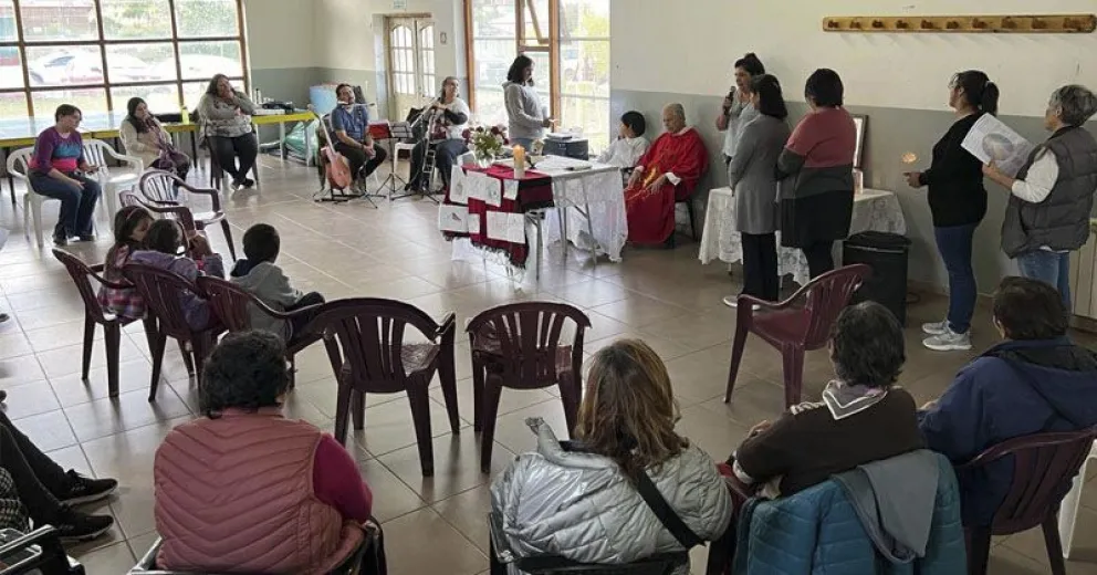 La casita de Jesús Misericordioso está ubicada entre los barrios El Frutillar y Unión, pero como no cuentan con espacio suficiente decidieron reunirse en el salón.
