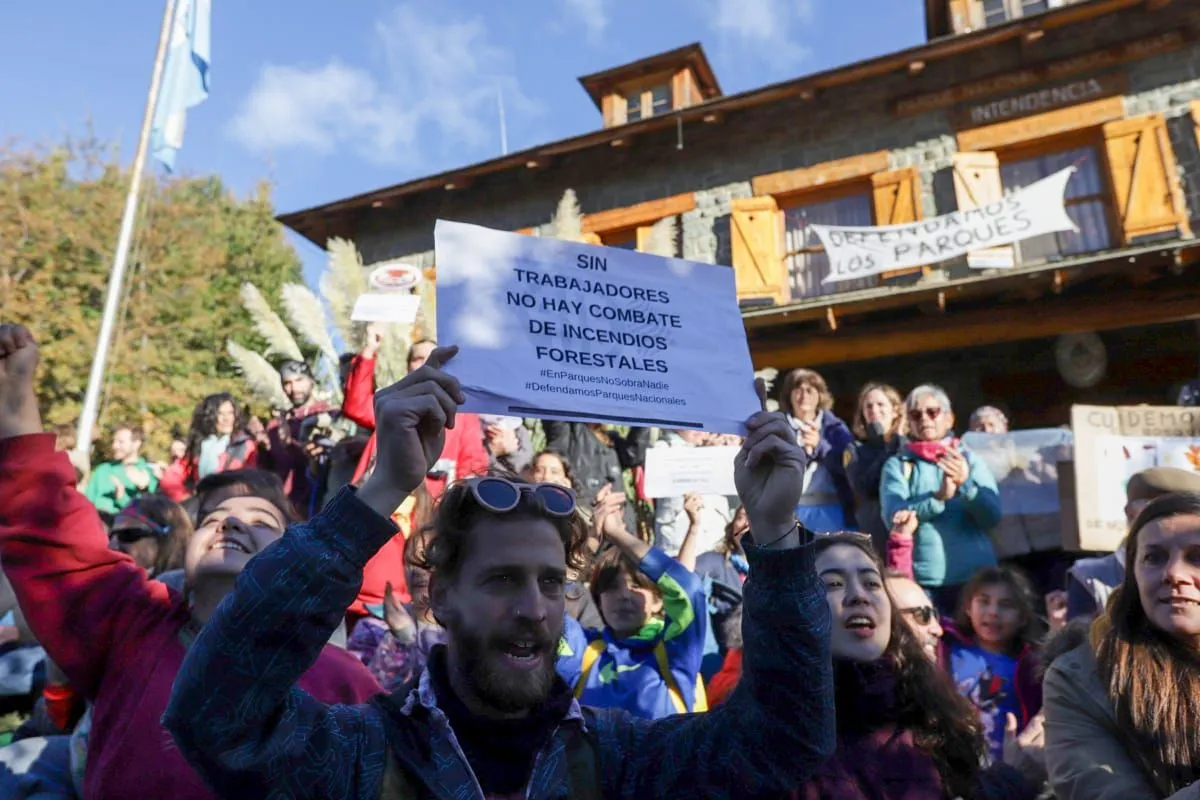 Este sábado desde las 16 horas, trabajadores y trabajadoras del Parque Nacional Nahuel Huapi se concentraron frente a la Intendencia del parque, ubicada en San Martín y Morales, para realizar un abrazo simbólico en protesta por los despidos ocurridos recientemente en el área. Bajo la consigna "defendamos el parque", reclamaron por el cese de los despidos.