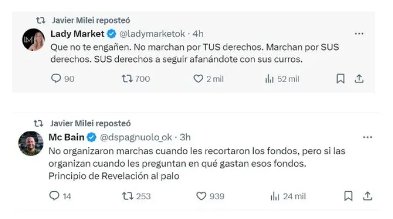 Los trolls de las redes, en particular los de la cuenta de X (ex Twitter), que son manejados por Fernando Cerimedo y el vocero Manuel Adorni, fueron los encargados de atacar duramente la marcha, mientras que Milei respaldó estos mensajes agraviantes.