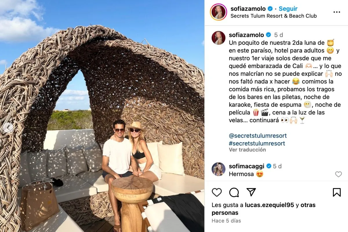 “Un poquito de nuestra segunda luna de miel en este paraíso, hotel para adultos y nuestro primer viaje solos desde que me quedé embarazada de Cali… Y lo que nos malcrían no se puede explicar, no nos faltó nada por hacer, comimos la comida más rica, probamos los tragos de los bares en las piletas, noche de karaoke, fiesta de espuma, noche de película, cena a la luz de las velas… Continuará”, expresó Sofía en Instagram, con varias fotos junto a su marido.