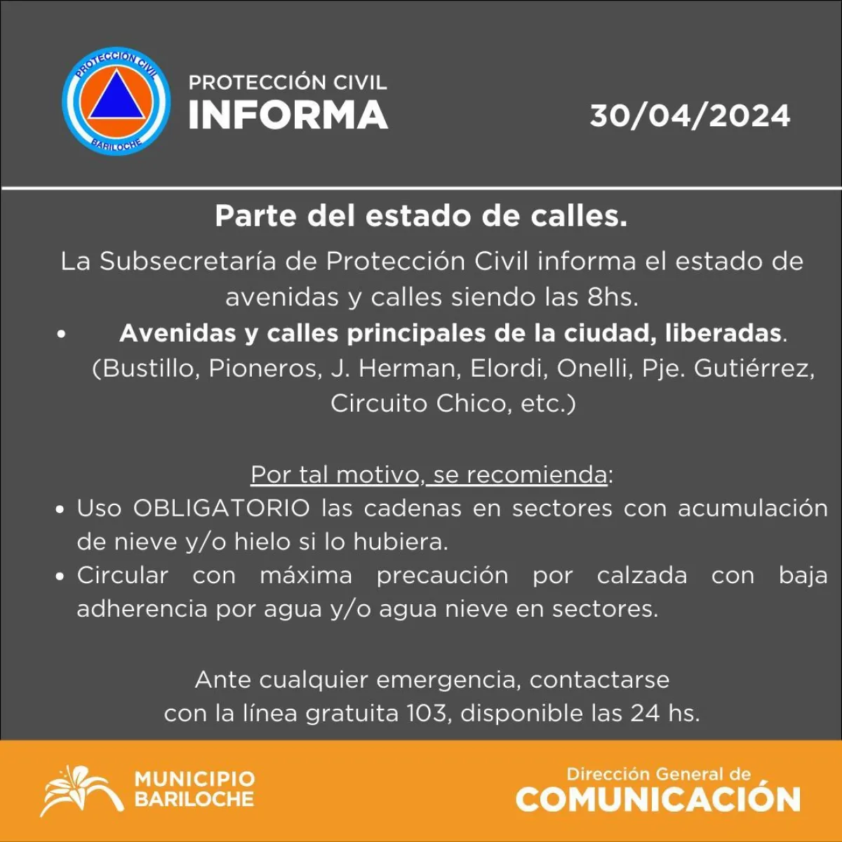 Es por esto que el programa "Agenda" conducido por Daniela Lucero emitido por El Cordillerano Radio (93.7) dialogó con Carlos Madjinca, Secretario de Protección Civil de la Municipalidad de Bariloche, quien confirmó que "en la zona sur las calles están despejadas porque desde las 4 de la mañana personal municipal se encuentra trabajando en el área. En los kilómetros se encuentra la Avenida Bustillo liberada así como la Avenida de los Pioneros que se encuentra totalmente despejada. Pasado este punto de la zona del Oeste la nieve que está cayendo en este momento puede traer alguna complicación. El centro de la ciudad se encuentra sin inconvenientes".