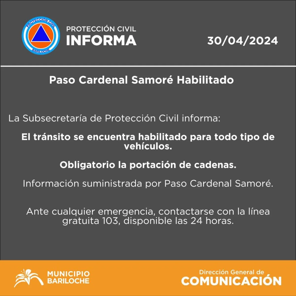 Luego de realizar trabajos en ambos lados de la frontera y ante la disminución de las nevadas, habilitaron el Paso Cardenal Samoré para todo tipo de vehículo. De igual manera se mantiene la obligatoriedad en el uso de cadenas, y sigue habiendo personal de vialidad trabajando en la zona.
