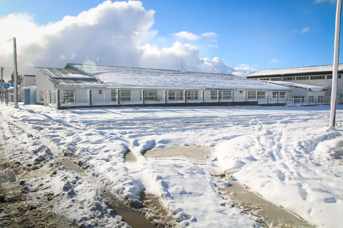La ciudad luce cubierta de nieve este domingo, hasta ahora soleado. Se mantiene el alerta amarillo por nieve para mañana lunes. Habrá que estar atentos para saber qué sucede con el dictado de clases.