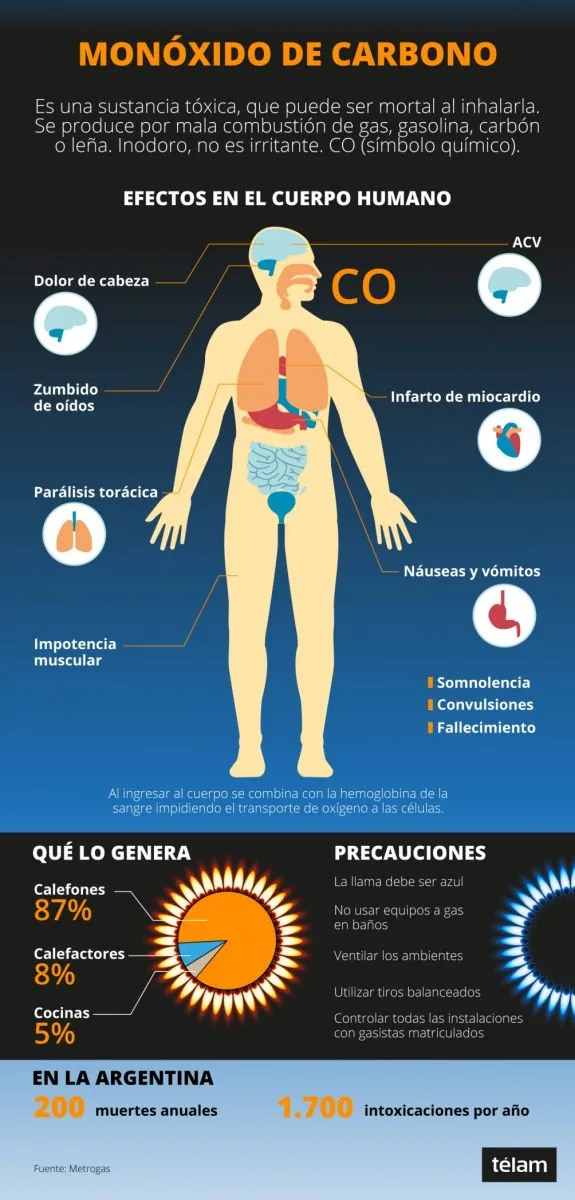 El monóxido de carbono es altamente tóxico e imperceptible y la mayoría de los accidentes por inhalación son evitables. Los principales síntomas son náuseas, vómitos y dolor en el pecho.
