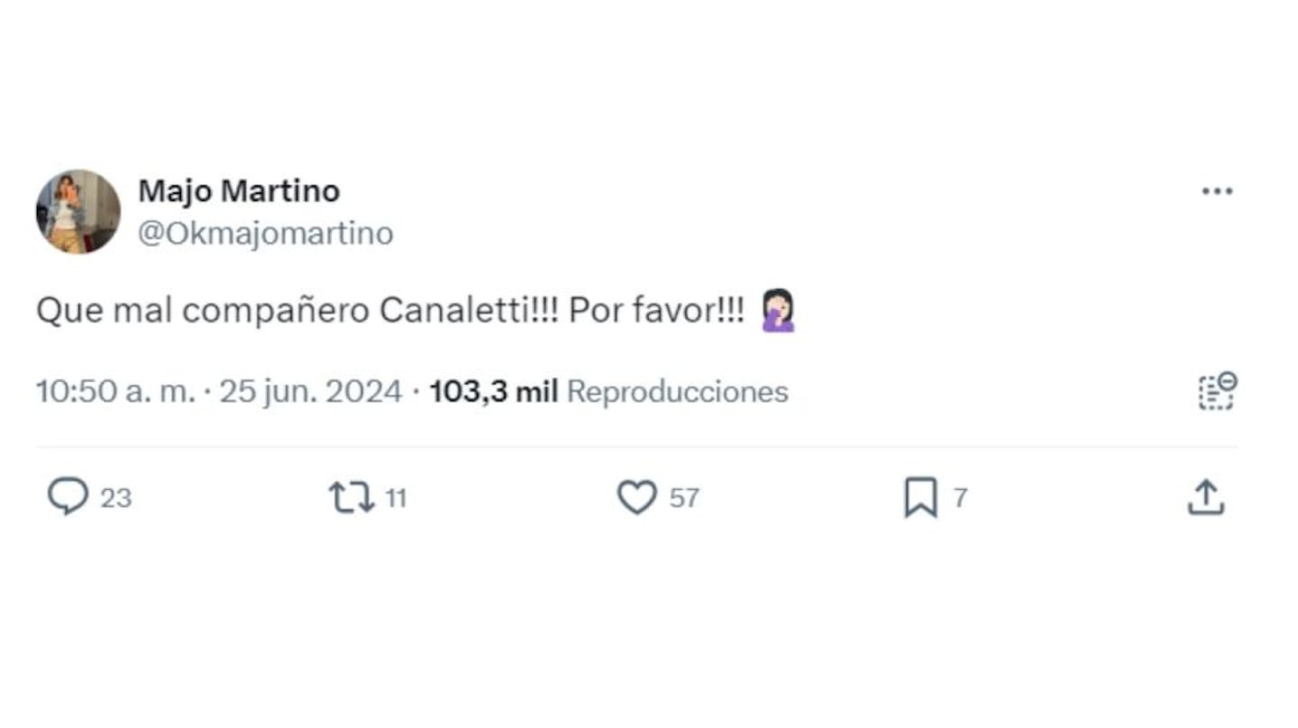 Si bien todo parecía que se tornaba a modo de un chiste, lo cierto es que había una verdad escondida en cada frase de ambas partes, por lo que los cruces hicieron que cada vez todo sea más incómodo. Para colmo, luego del programa, la movilera tuiteó enojada: “Qué mal compañero Canaletti!! Por favor!!”.
